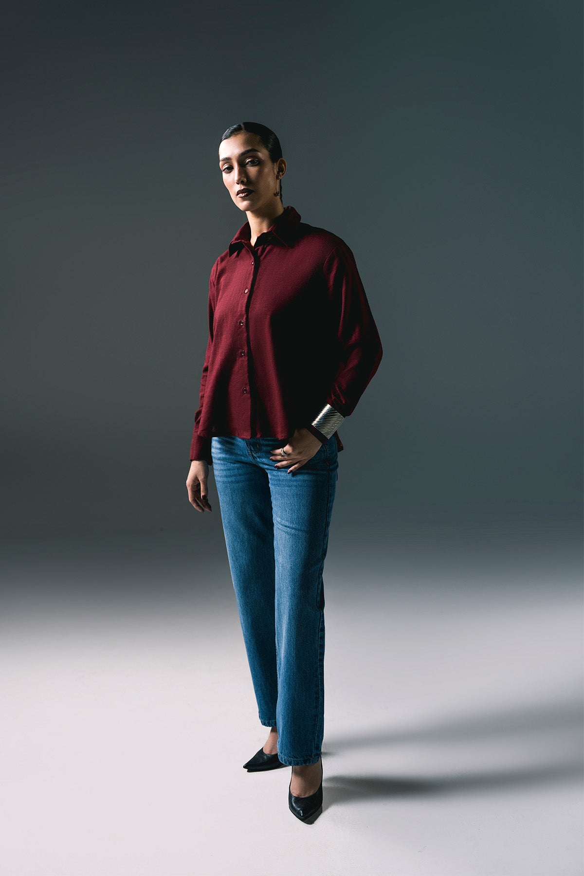 Stay stylish and cozy with this women’s maroon khaddar button-down shirt. Crafted from soft, breathable khaddar fabric, it offers a comfortable fit ideal for daily wear. The classic button-down design ensures a timeless, versatile look that pairs effortlessly with trousers, jeans, or skirts. Perfect for casual outings or smart-casual ensembles.